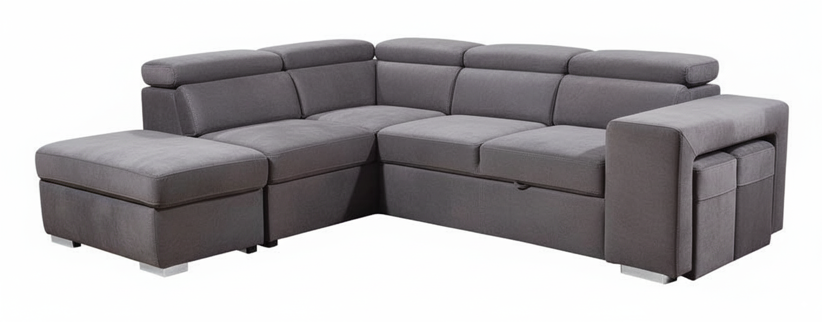 • Description du produit : Salon d'angle convertible avec 5 tétières réglables de 82 à 102 cm et 2 poufs. Pouf coffre inclus. Dimension couchage:117 x 185 cm. Revêtement 100% polyester. Structure en bois. Densité assise 35 kg/m3. Pieds plastique. A assembler.