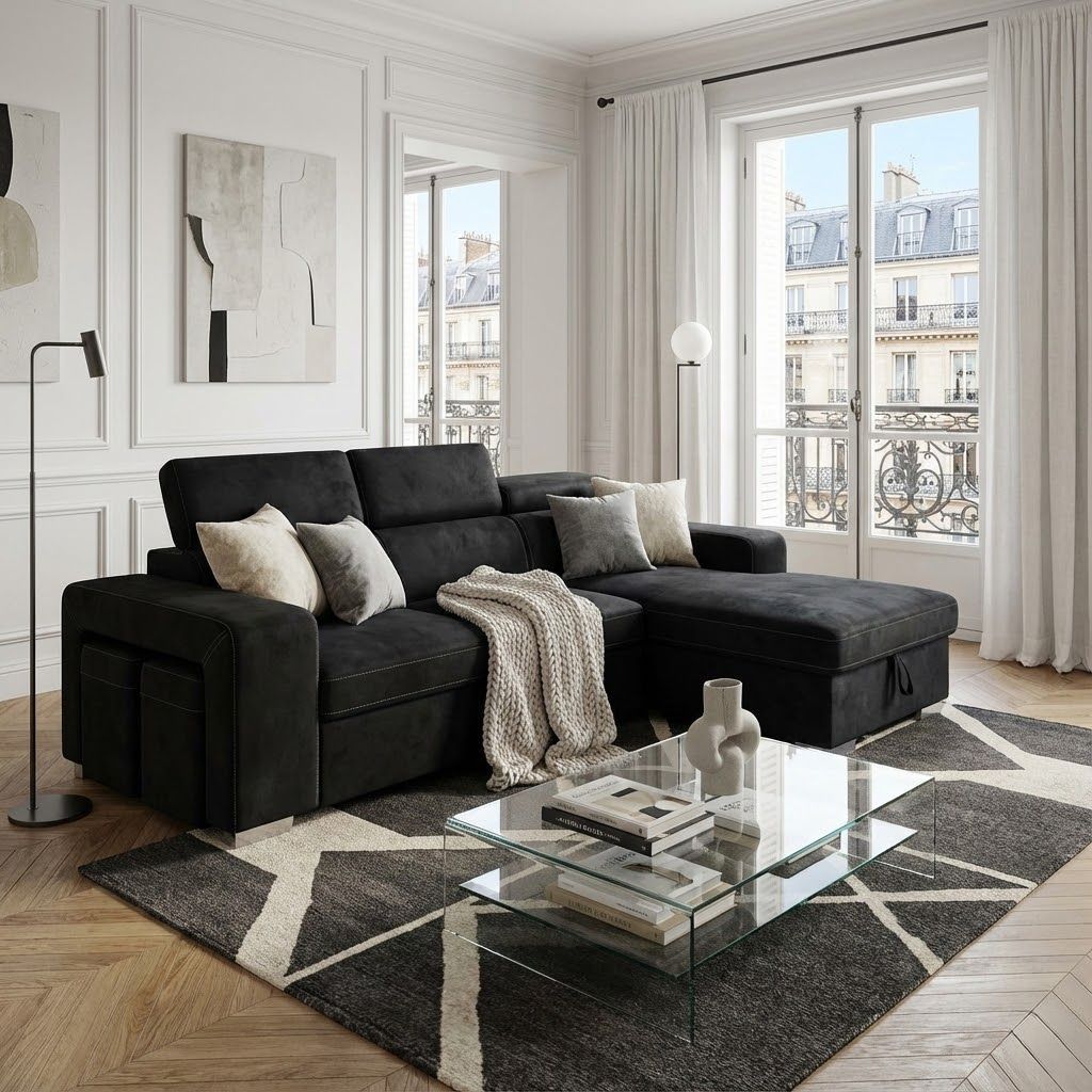 • Description du produit : Salon d'angle convertible avec 5 tétières réglables de 82 à 102 cm et 2 poufs. Pouf coffre inclus. Dimension couchage:117 x 185 cm. Revetement microfibres Crown. Structure en bois. Densité assise 35 kg/m3. Pieds plastique. A assembler.