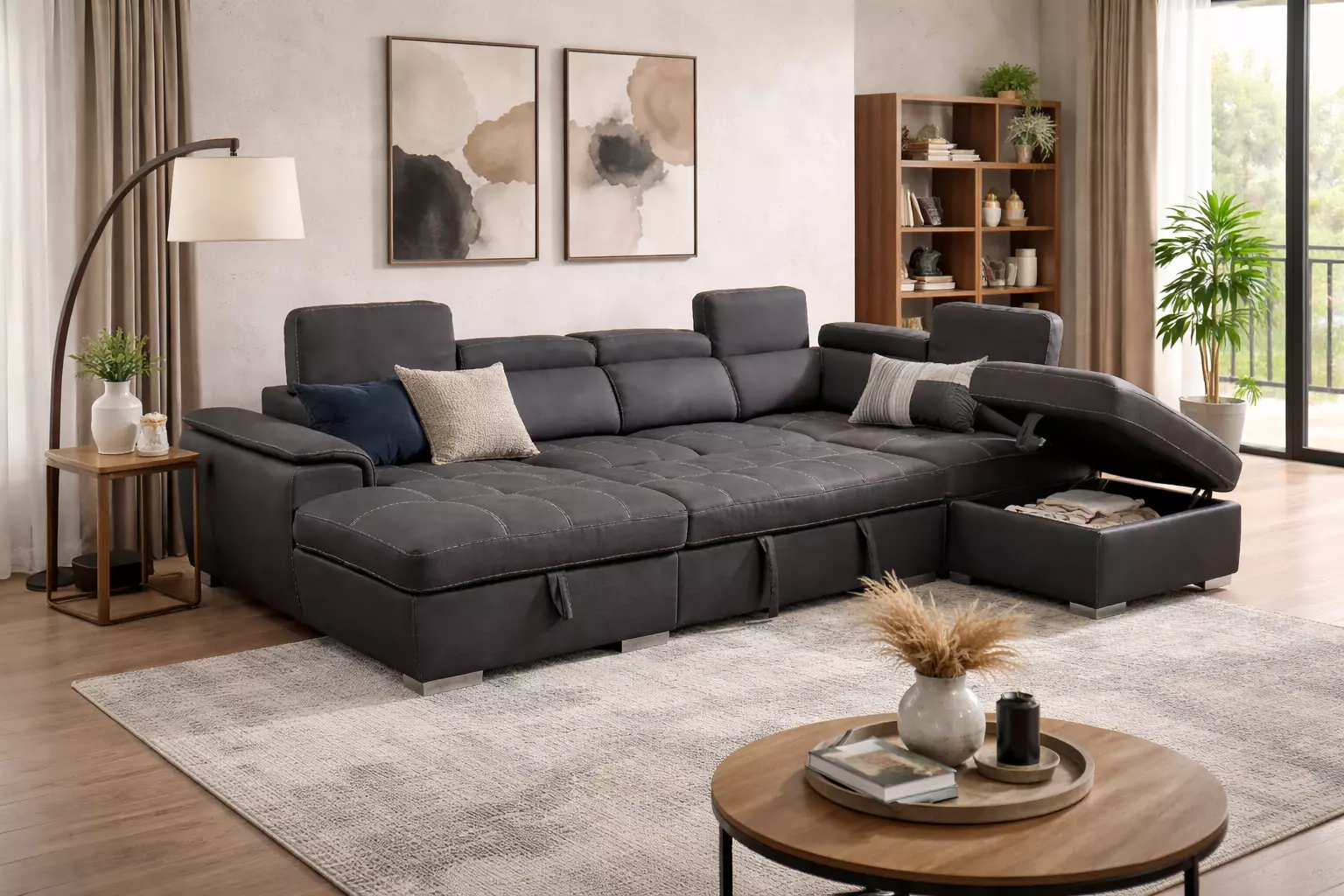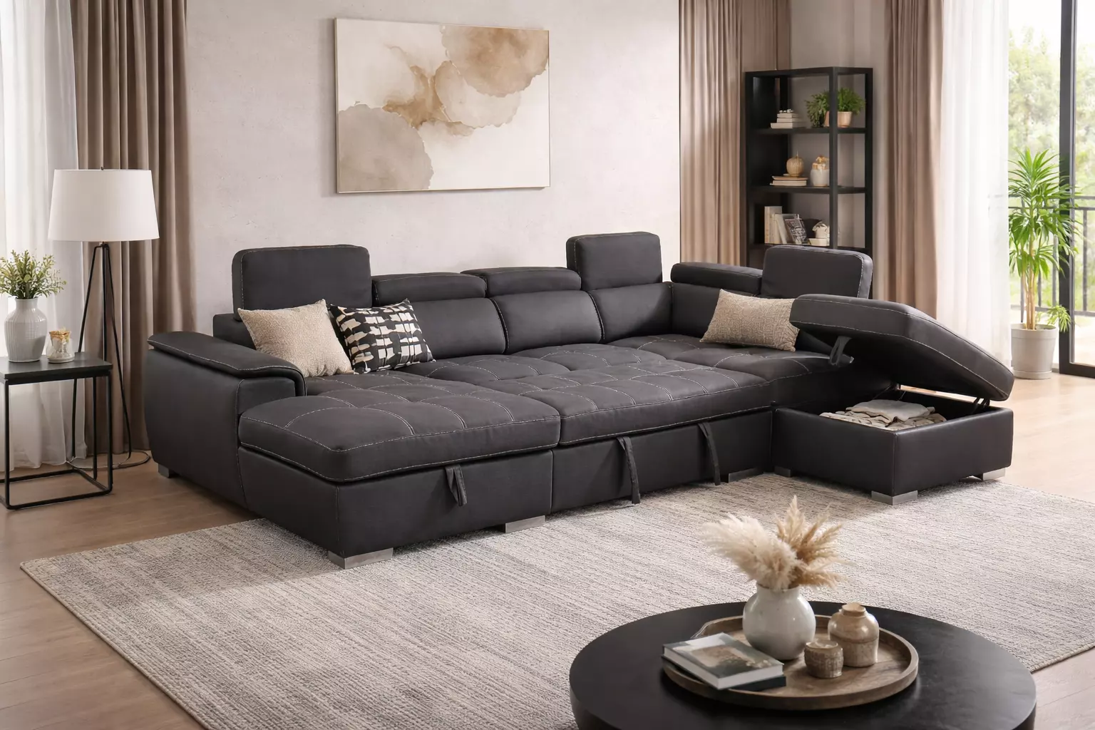 • Description du produit : Grand Angle convertible gigogne Meridienne+ 2 place + angle+ pouf coffre« CAPRI U M2ap» Simili Renforcé noir