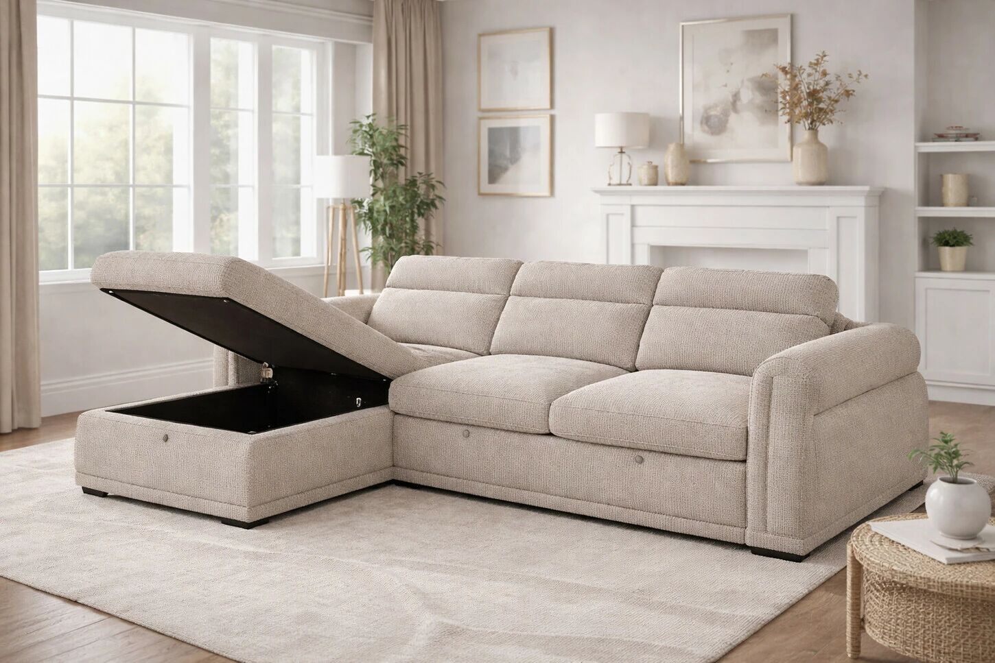 • Description du produit : Angle convertible droite NON reversible COTYBED avec méridienne coffre- Tissu - Appuie-tête réglables