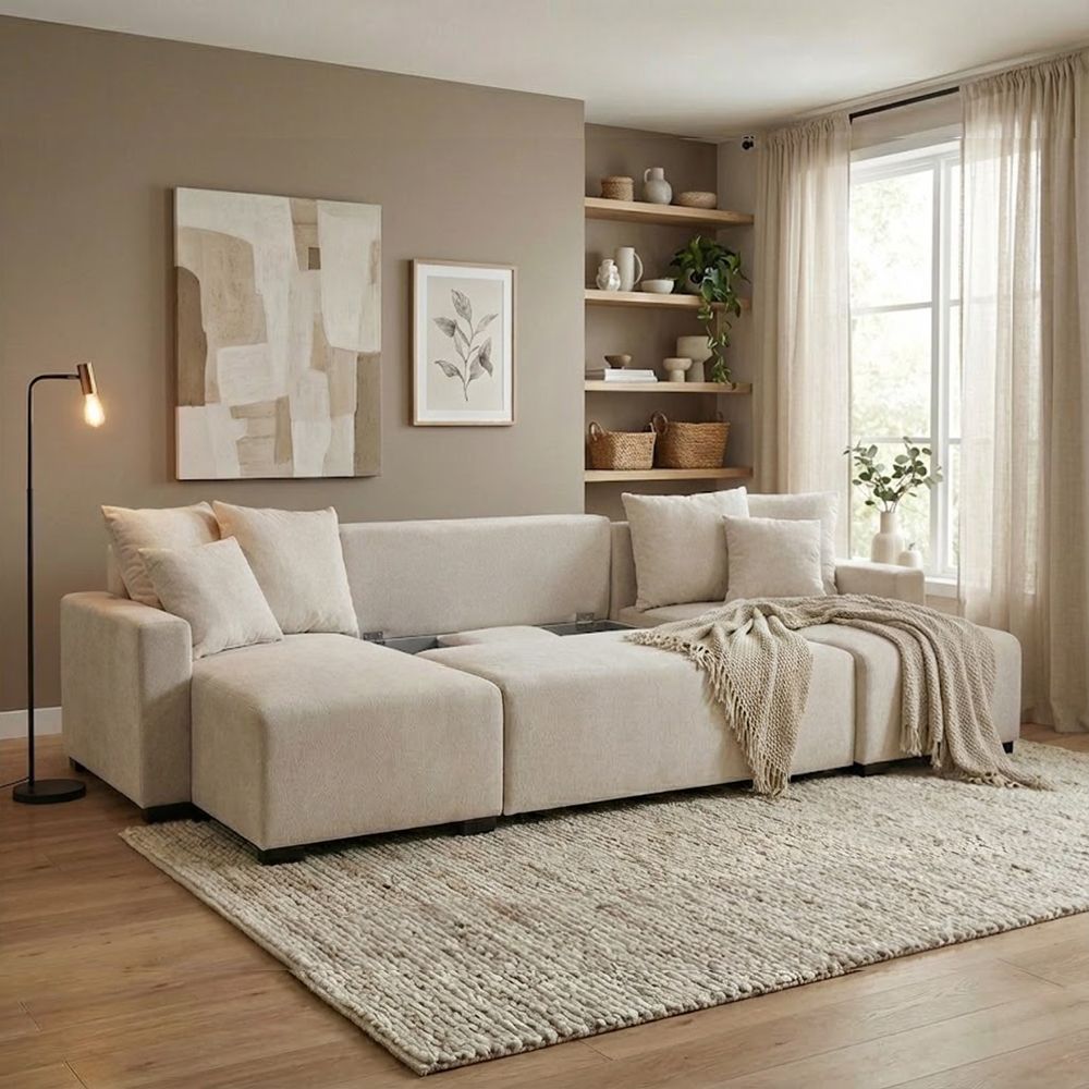 • Description du produit : Grand salon d 'angle en forme U comprenant 1 grand coffre de rangements. Angle du canapé :P anoramique Couleur : Blanc Tissu bouclé blanc, reversible, non déhoussable