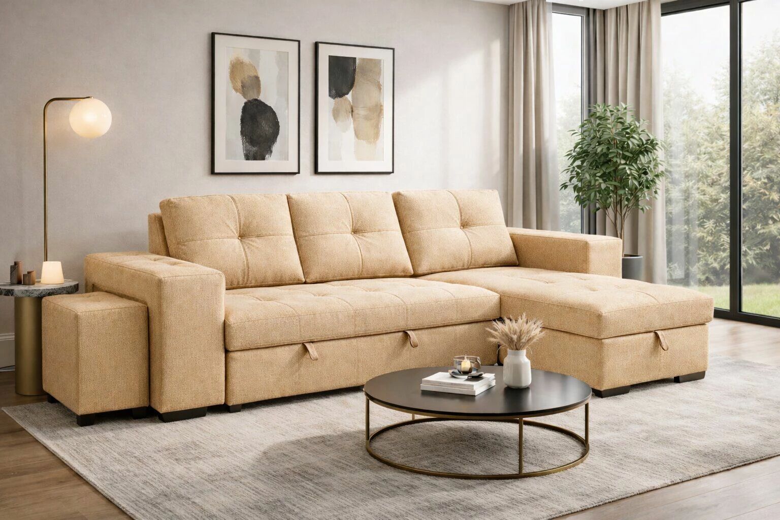 Accueil > Autres canapés convertibles > Fonctionnalités > Système gigogne > IBIZA, Canapé d'angle reversible convertible Gigogne avec Chaise longue coffre et pouf
