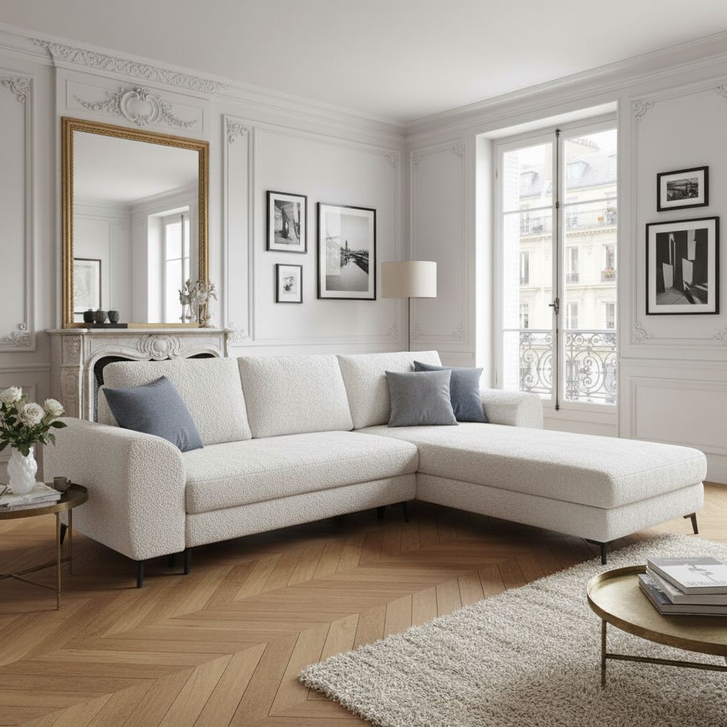 LOS ANGELES, Canapé d'angle réversible convertible gigogne, en tissu bouclé blanc