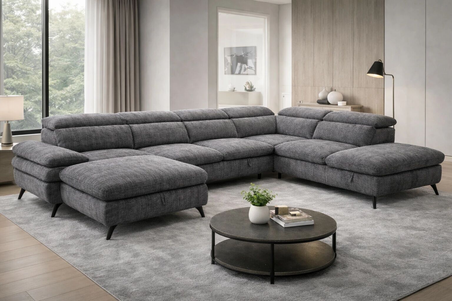Accueil > Autres canapés convertibles > Fonctionnalités > Système gigogne > MURANO, Grand canapé panoramique angle droite convertible Gigogne non reversible en tissu Astra