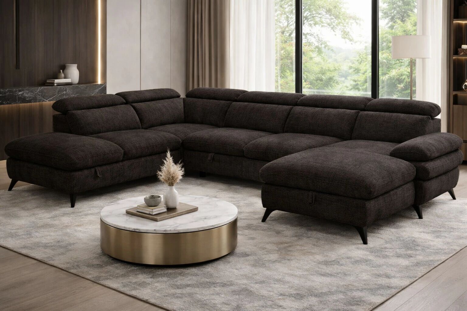 Accueil > Autres canapés convertibles > Fonctionnalités > Système gigogne > MURANO, Grand canapé panoramique angle gauche convertible Gigogne non reversible en tissu Astra