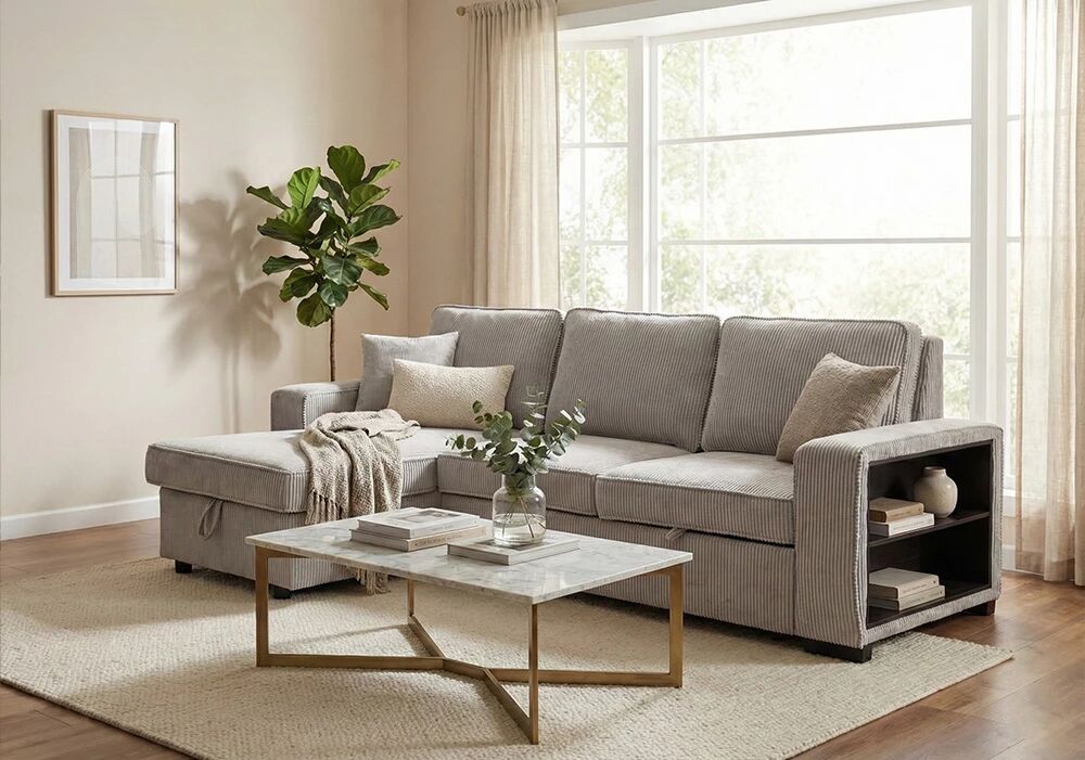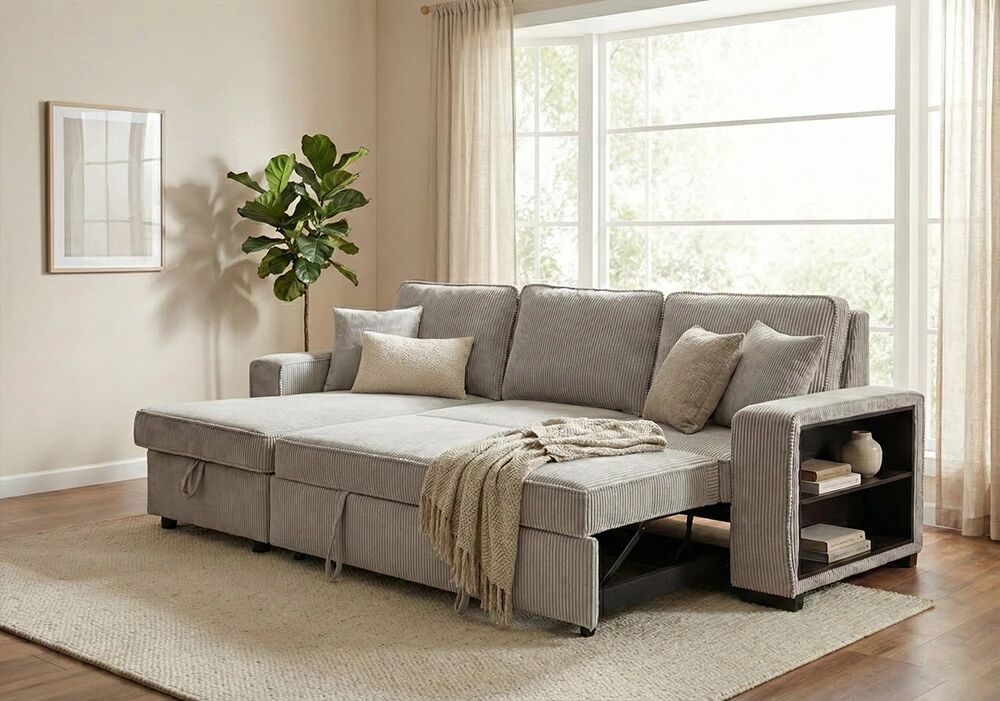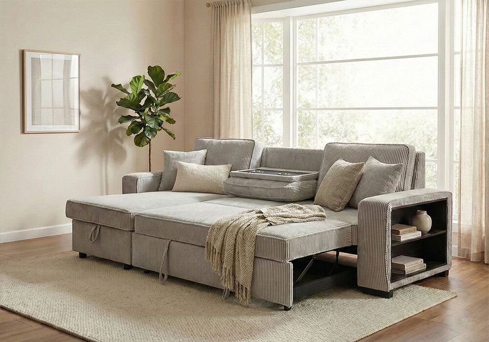 • Description du produit : Grand Angle gauche convertbible gigogne Non reversible 2 places + angle+ pouf coffre NERO+CL en velours COTELE. Non déhoussable