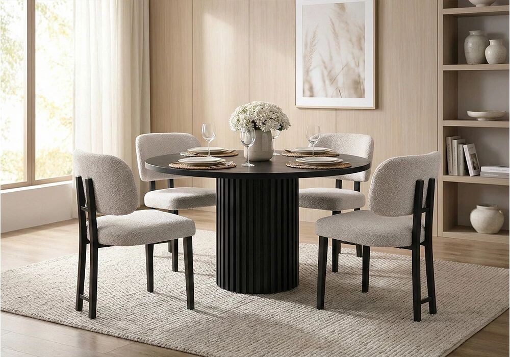 Accueil > Meubles > Offres Tables + Chaises > OLYMPUS Table ronde pieds style colonne + 4 Chaises Dragon Tissu Bouclette Blanc Pieds noir
