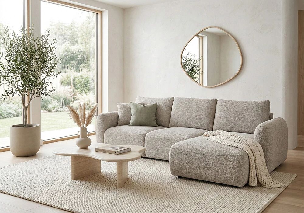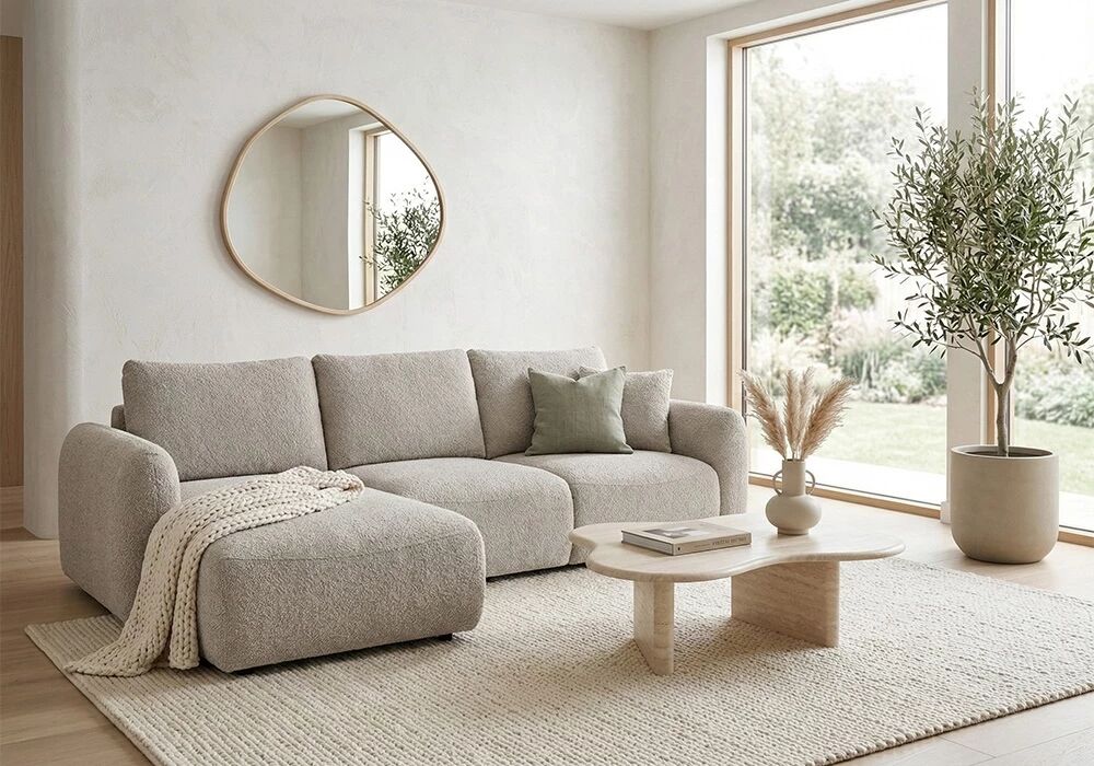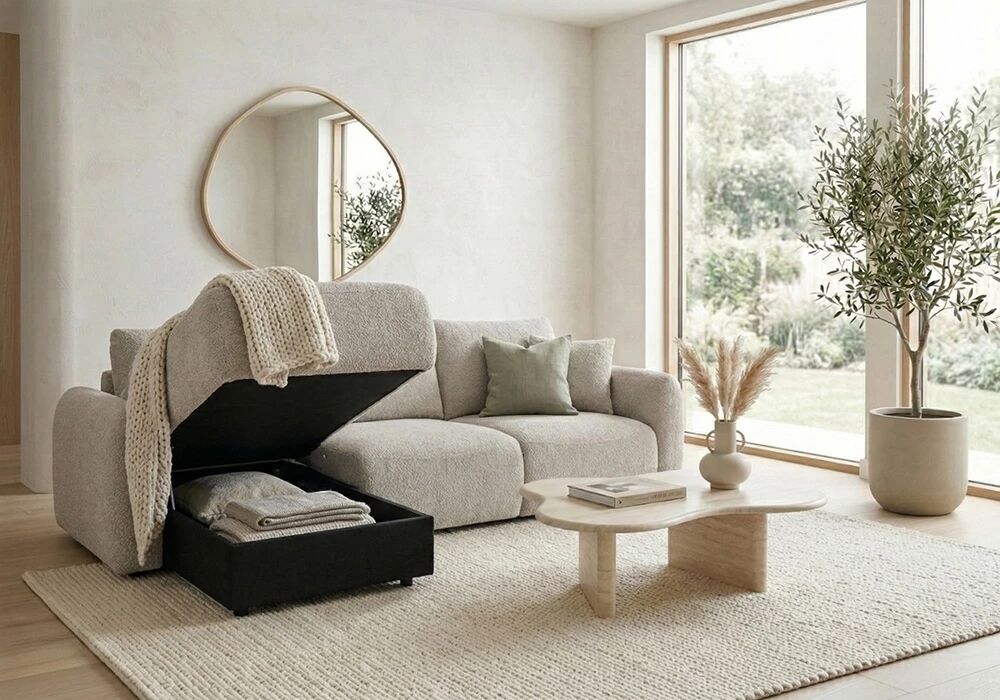 PRADO, Canapé convert gigoge 2 places + Meridienne coffre. Tissu chiné (270*172cm) non reversible